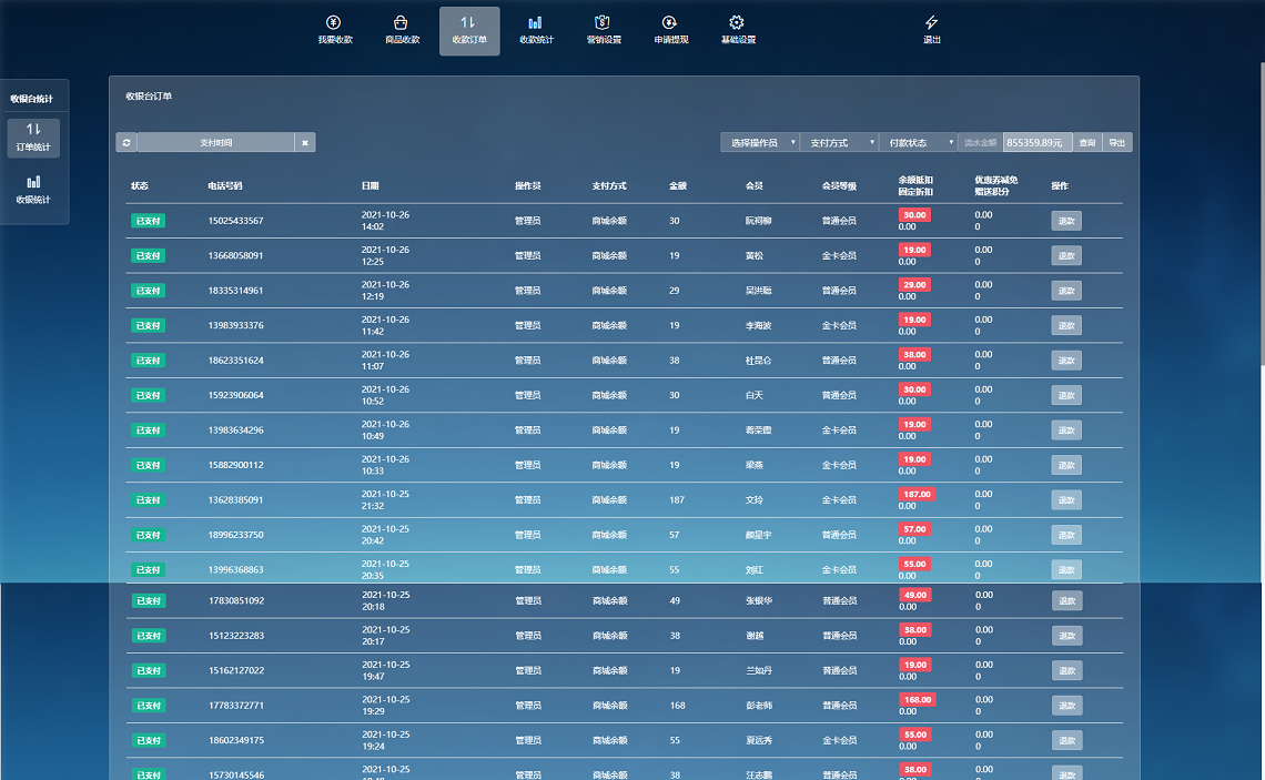 收银台还带有收银分类统计,退款排名等辅助功能。